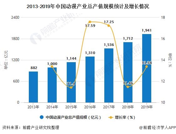 2014年以来,我国动漫内容生产实力得到了进一步提升,类型和题材日趋多元化,在国家政策和资金的保驾护航下,动漫产业集群带和产业区培育出现端倪。加之,在媒介融合的气氛熏陶下,2019年我国动漫产业已达到1941亿的总产值规模,同比增长13.38%。