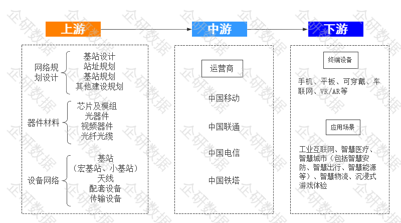 5G 产业链是由网络规划设计、器件材料、传输设备、运营商以及终端设备(应用场景)组成。其中产业链上游主要为网络规划、器件材料以及传输设备,这是 5G 规模组网建设的基础,也是最先投资建设的部分;中游为运营商,利用上游基础设施为下游用户提供服务;下游则为终端设备,用户通过终端电子设备获得5G网络的服务。