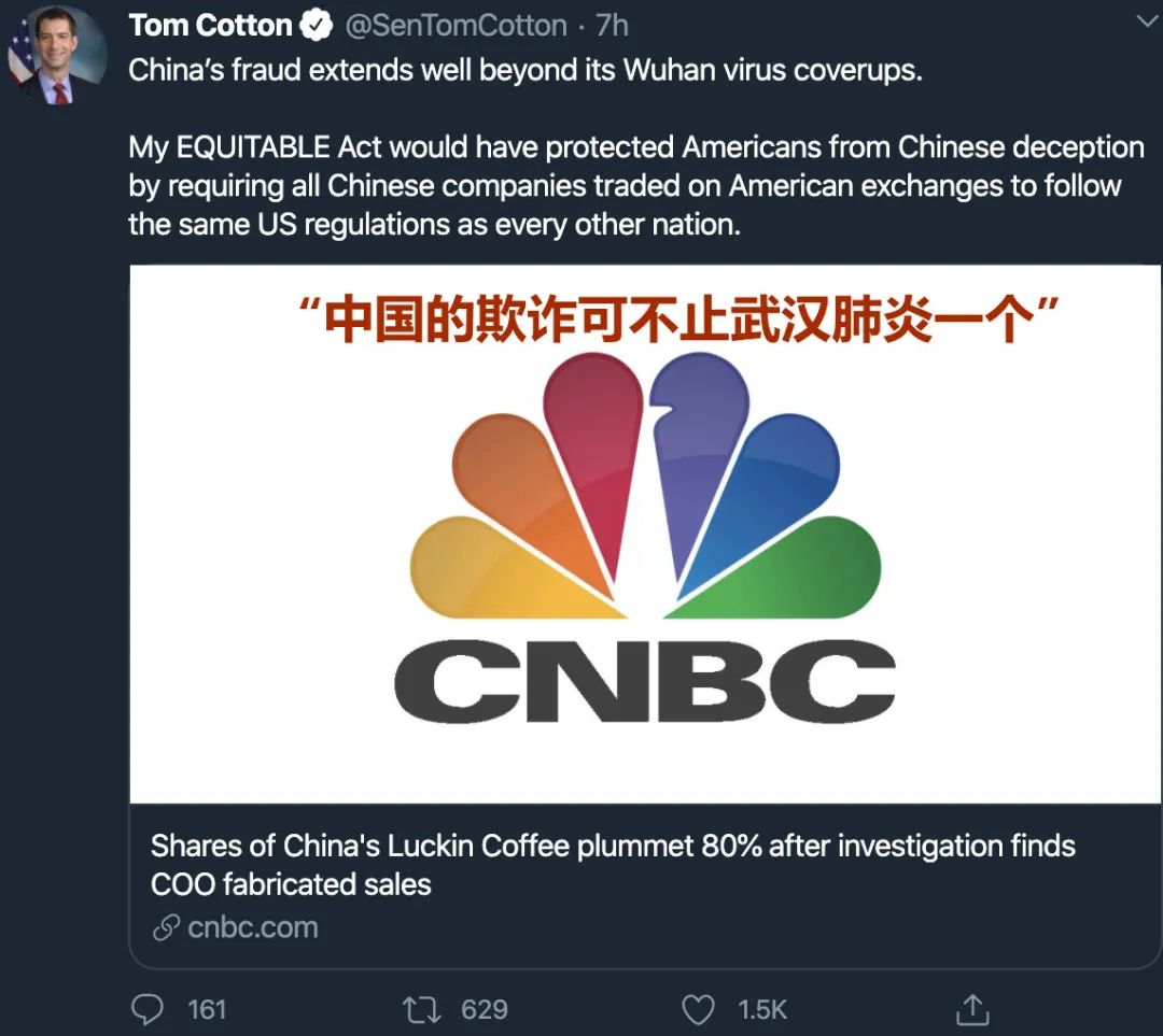 另有熟悉美国资本市场的童鞋称:“瑞幸对中概股的影响挺大的,但和中美关系没啥关系。更为主要的是,现在全球疫情本来市场信心就不足,再加上瑞幸造假,这会对筹备在美国上市的公司带来不利影响,甚至,可以说,美股上市的窗口暂时是关闭了。”