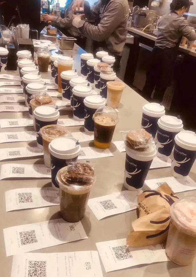 但这些外卖小哥似乎并没有关注到,他眼中只有挤满桌子的咖啡,由于疫情原因,门店还没有全员复工。