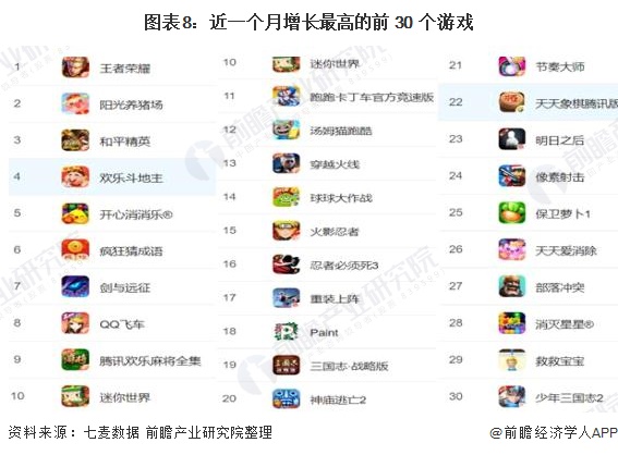 移动游戏头部效应明显。根据七麦数据,近一个月,全平台增长最高的是腾讯旗下的王者荣耀,此外,腾讯旗下的和平精英、欢乐斗地主,分别位列第三、第四,其旗下的QQ飞车、欢乐麻将位列第八、第九,增长排名前30的游戏中,腾讯旗下游戏有11款,占比三分之一以上,头部效应明显。