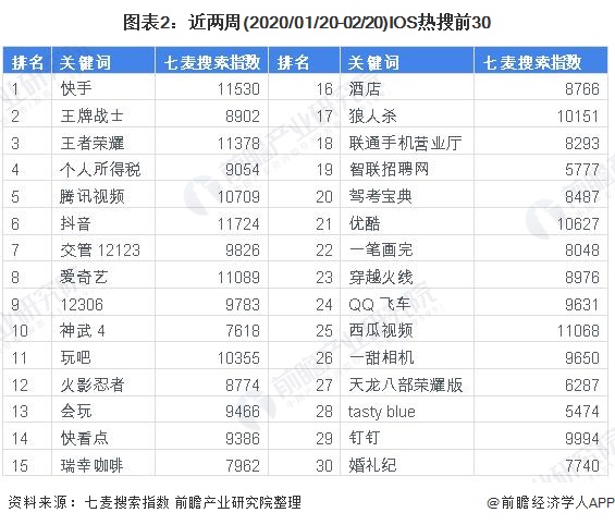 近两周(2020/01/20-02/20)IOS热搜前30的关键词,“王牌战士”、“王者荣耀”等游戏、“腾讯视频”、“优酷”、“爱奇艺”等视频网站、“快手”、“抖音”等直播平台受到广泛关注。