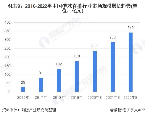 这次疫情对不少行业有着重要影响,其中,可以足不出户的游戏直播行业进入了大众的视野。通过前瞻产业研究院研究发现,游戏直播行业市场规模每年成20%以上的速度增加,预计到2022年,市场规模将达到342亿。行业正处于深度商业化的进程中。头部位置几大平台,不断开拓创新性付费服务(如弹幕抽奖、主播陪玩、赛事竞猜等),拉动用户打赏付费,推动行业规模持续提升。