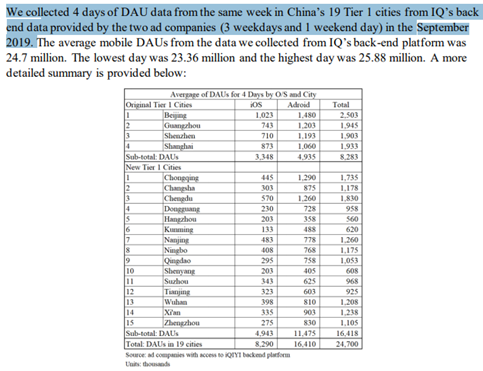 (1)两家广告公司是否覆盖了一线城市的所有终端,大部分数据监测公司是通过监测部分终端数据,然后通过算法模型衍生出整体数据,其中有误差是正常现象;(2)两家广告公司的DAU统计口径和定义是否与爱奇艺公开的数据在方法论上相同;