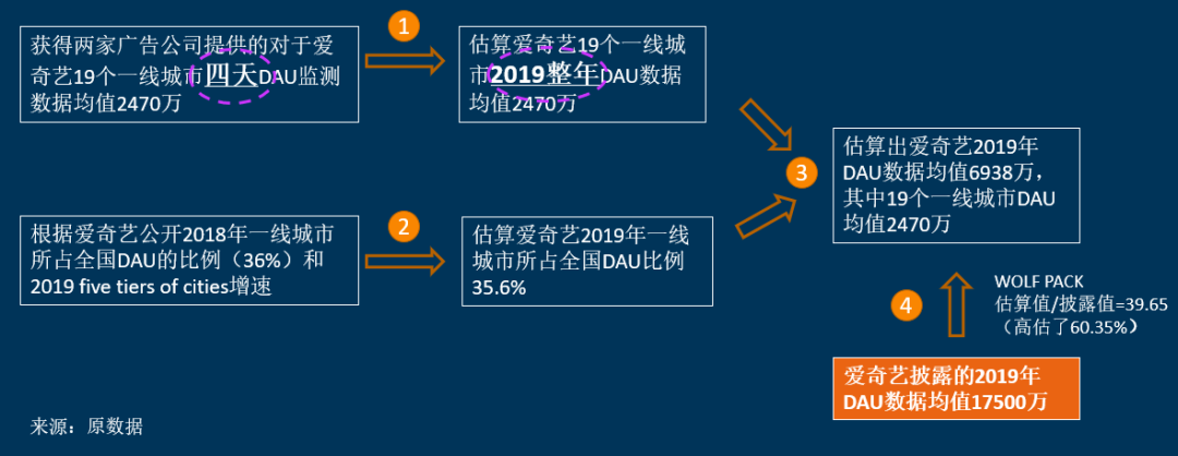 WOLF PACK认为爱奇艺虚增DAU(日活跃用户数),其核心数据依据是来自于两家广告公司对于爱奇艺在19个一线城市的DAU监测数据,并参考爱奇艺2018年公开的一线城市DAU占比为36%,从而得出其至少虚增42%-60%的DAU数据指标。原数据将WOLF PACK估算判断的逻辑做成如下示意图: