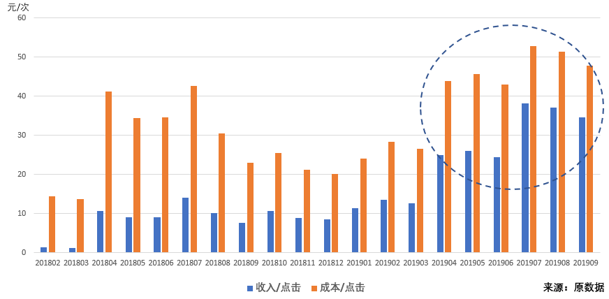 原数据根据瑞星咖啡公开的2018年9月至2019年9月财务数据,假如营业收入和营业成本是真实的,结合Luckin Coffee APP月度使用次数,可以计算出瑞幸每个月的ARPC(平均单次点击收入)和ACPC(平均单次点击成本,包括公司管理、销售、研发费用、生产成本),计算结果发现:2018年9月-2019年3月期间,ARPC是10.47元,ACPC是 24.12元,而2019年4月-2019年9月期间,ARPC是30.86元,ACPC是47.40元。瑞幸咖啡在2019年4月开始,其平均单次点击所带来的收入和成本数据,开始出现异常变动,明显与事实不符,且成本的增加量与收入的增加量非常接近。