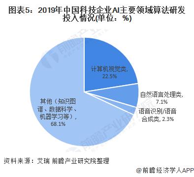 根据艾瑞数据分析,2019年中国科技企业技术研发投入约为4005亿元,其中人工智能算法研发投入占比为9.3%,超370亿元,且大部分投入来自互联网科技公司。主要Al算法应用领域——计算机视觉、语音识别/语音合成,以及自然语言处理占比分别为22.5%、2.3%和7.1%,三者中计算机视觉相关算法研发投入占比最大,这与视觉相关创业公司数量、产业需求和政策导向呈正相关联系,计算机视觉目前仍是中国最具代表性的Al应用技术。