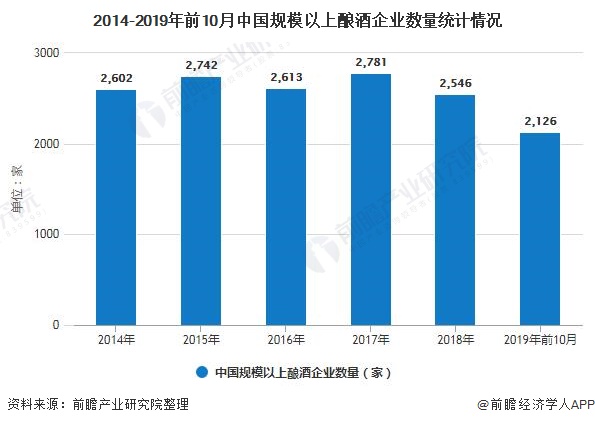 2014-2018年我国规模以上酿酒企业呈现出波动平缓下滑的趋势。截至2019年10月,全国规模以上酿酒企业大幅下滑,其数量为2126家,较2018年末下滑16.50%。