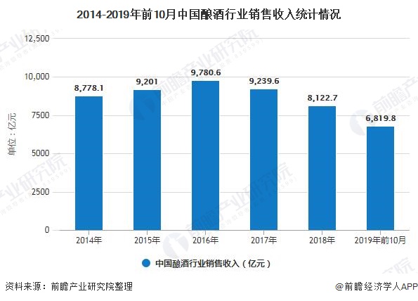 2014-2018年我国酿酒行业销售收入呈现先逐年上升再逐年下降的趋势,2016年我国酿酒行业销售收入为9780.6亿元,较上期增长6.3%,为历年最高值;随后我国酿酒行业营业呈现出下滑趋势,2018年其销售额为8122.7亿元,较上年下降12.09%;2019年1-10月酿酒行业实现营业收入6819.8亿元,较上年同期增长8.7%。