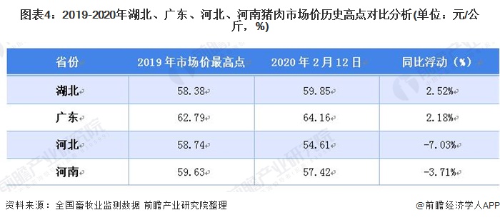 分地区看,猪肉价格在疫情期间的上浮水平与疫情严重程度呈现正相关。以湖北、广东、河北、河南猪肉市场价的变化情况为例,可以看到这四个省份的猪肉价格变化趋势近似,但2020年初,湖北广东二省价格攀升幅度略大。截至2020年2月12日,湖北广东两地的猪肉市场价格已经突破了2019年猪肉价位的最高点,而河北河南的猪肉市场价距离2019年的猪肉价位最高点仍有一定的距离,且其价格上浮水平与疫情严重程度呈现正相关的关系,疫情最严重的湖北省2月12日的猪肉市场价较2019年峰顶高出2.52%,居四个省份的首位。