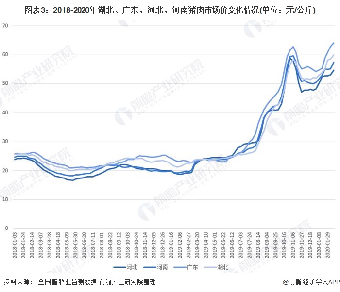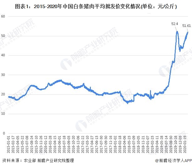 2018年以来,受猪瘟影响,中国猪肉市场供需矛盾进一步加剧,推动猪肉价格飞涨,中国白条猪肉平均批发价于2019年10月29日到达顶峰,为52.4元/公斤,随后受宏观调控,猪肉价格开始下跌,但猪肉市场供需矛盾的改善需要一定的时间,且春节临近,猪肉需求上升,2019年末猪肉价格又开始出现上涨的势头。