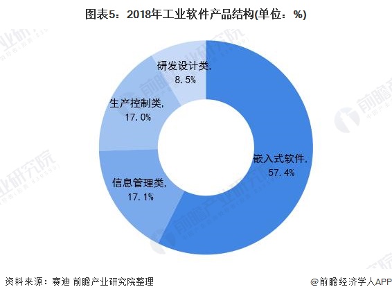 从各类工业软件结构上看,目前嵌入式软件占据较大的市场份额,约为57.4%。研发设计类软件主要用于提升企业在产品设计与研发工作领域的能力和效率,CAD、PLM和EDA为其最有代表性的产品;生产控制类软件用于提高制造过程的管控水平、改善生产设备的效率和利用率,其中MES是其最具代表性的产品。嵌入式软件则广泛应用于工业通信、能源电子、汽车电子等各个领域。