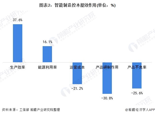 中国工业和信息化部遴选出了305个智能制造试点示范项目,涉及92个行业类别,覆盖全国境内所有省(自治区、直辖市),拉动投资超过千亿元人民币。初步统计下,这些项目智能化改造前后对比,生产效率平均提升37.6%,最高3倍以上;能源利用率平均提升16.1%,最高达到1.25倍;运营成本平均降低21.2%,产品研制周期平均缩短30.8%,产品不良率平均降低25.6%,智能制造控本提效作用明显。