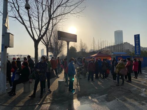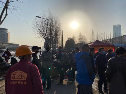 冷清了近两个月,这条路重新回归热闹。3月19日,天色刚亮,昏黄的路灯下,一边的人行道上停满了电动车,而另一边是一眼望不到头的临工队伍,保守估计接近1000人。