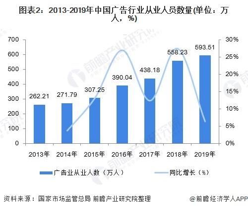据国家市场监督管理总局数据显示,2019年中国广告行业从业人员数量约为593万人,同比2018年增长6.32%,相较于前几年增速有所收窄。