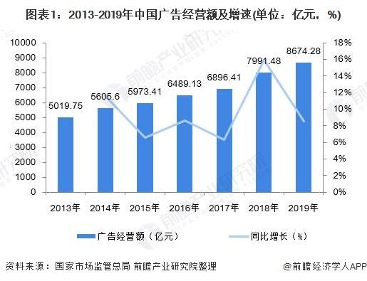 据国家市场监督管理总局数据显示,2019年中国广告经营额达8674.28亿元,同比2018年增长8.5%,人均广告消费额为619.57元人民币。总体来看,2019年国内广告行业受宏观经济影响,广告市场处于持续调整中,与2018年相比增速有所下滑,但整体呈现增长态势。