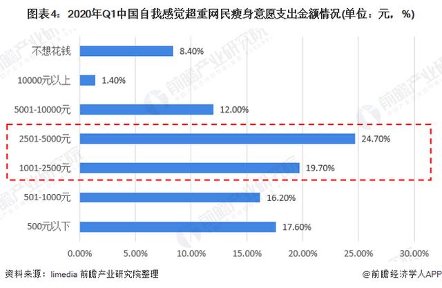 据调查,2020年Q1我国自我感觉超重网民瘦身意愿支出金额的网民比重较高,其中愿意支出1001-5000元的网民比重累计达44.4%。愿意支出1001-2500元的网民比重为19.70%,愿意支出2501-5000元的网民比重为24.70%。