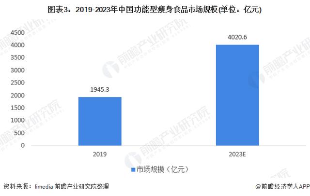 2019年我国健身瘦身下游我国功能型瘦身食品市场规模为1945.3亿元,2023年市场规模达4020.8亿元,年均复合增速达19.9%