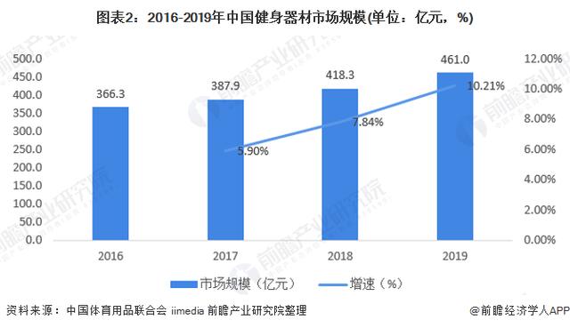 据统计,2016-2019年我国健身器材市场规模总体呈逐年增长态势。2019年我国健身器材市场规模为461亿元,同比增长10.21%。随着我国国民健身意识的不断增强,预计未来我国健身器材市场也将越来越大。