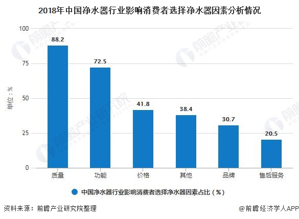 根据《2019中国净水器行业发展报告》数据显示,2018年,影响消费者选择净水器的因素中,质量、功能等因素成为了主要关注;其中,在净水器功能方面净水效果、更换滤芯的价格、显示水质更换提醒以及废水少为消费者较为关注的指标。