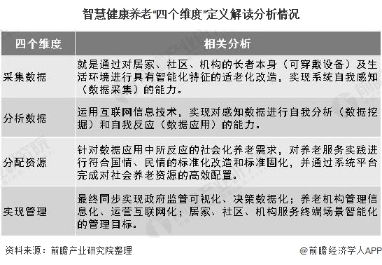 目前可以从四个维度来定义智慧健康养老:采集数据→分析数据→分配资源→实现管理。