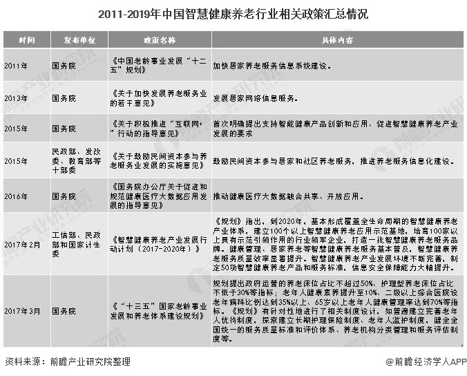 2015年,国家发布文件首次明确提出支持智能健康产品创新和应用、促进智慧健康养老产业发展的要求;到2017年三部委发布《智慧健康养老产业发展行动计划(2017-2020年)》,对的智能养老产业发展做出了规划部署。这些利好政策与信息,意味着智慧健康养老已开始上升至国家战略层面,不断推动行业发展。