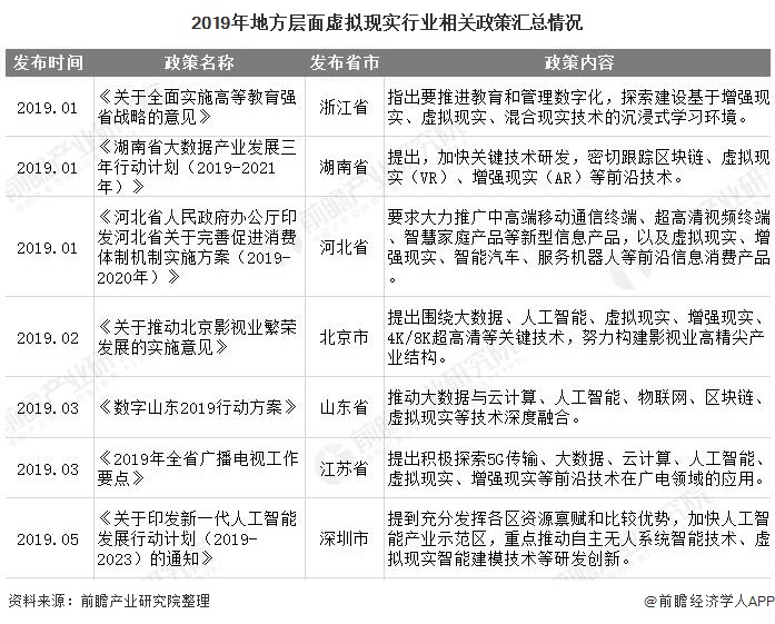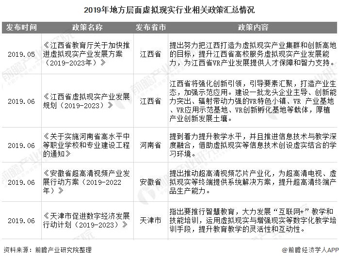 除了国家层面出台的政策外,各省市地区根据当地的房展特点,也纷纷出台产业政策,大力支持虚拟现实行业的发展。2019年1月,浙江省发布《关于全面实施高等教育强省战略的意见》,指出要推进教育和管理数字化,探索建设基于增强现实、虚拟现实、混合现实技术的沉浸式学习环境。