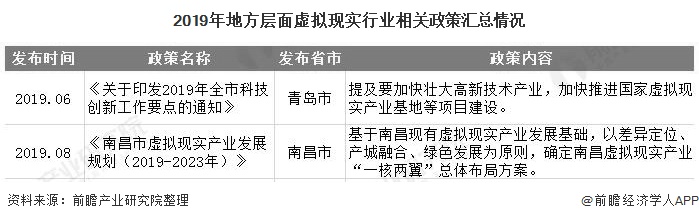 2019年地方层面虚拟现实行业相关政策汇总情况