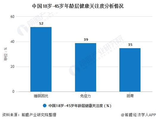 由于我国18-45岁的人群占据我国的人口的大多数。从18岁到45岁年龄层的健康关注度来看,睡眠关注度52%;免疫力关注度39%;肠胃关注度35%。当然除了共性问题外,不同年龄层也有自己的困扰。25岁以下注重皮肤和身材管理,26-45岁则注重体重管理。