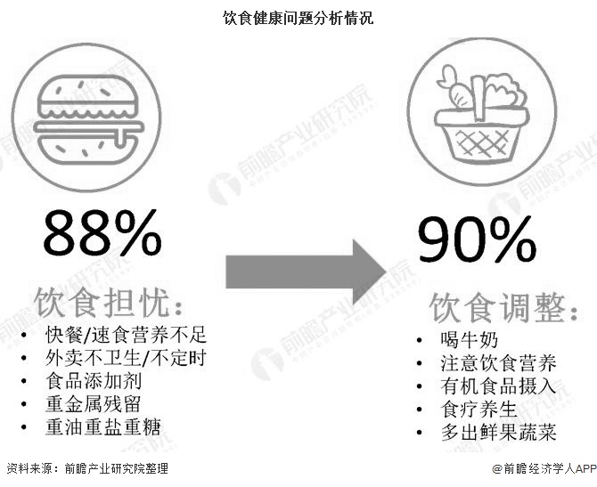 中国有“民以食为天”以及“病从口入”的谚语,说明从古至今,中国人对食物好坏的关注度都是极高的。据调查,现代社会约有88%的人群对摄入的食品产生担忧,而同时有90%以上的人群试图通过饮食调整来改变饮食结构。人们对食品的要求为更少人工添加剂、脂肪/热量低、少加工工程、原料天然。人民的饮食习惯已经从“好吃的”逐渐转换成“吃好的”。