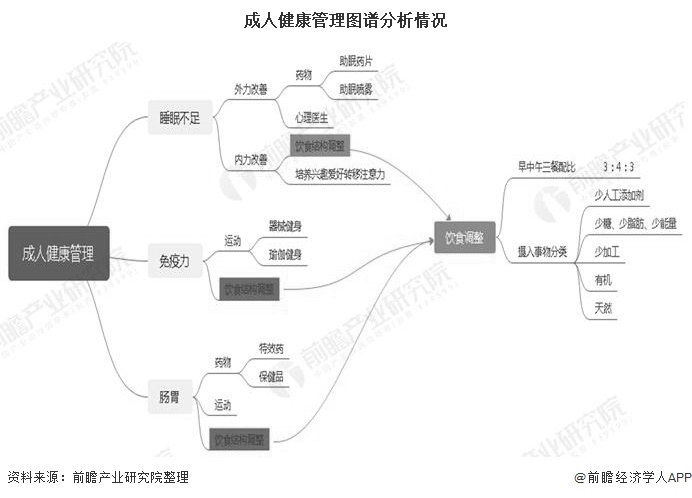 从成人健康管理图谱出发,健康管理的核心主要在于内动力,即医生为辅,自我调控为主。减肥中的“迈开腿,管住嘴”一样适用于健康管理,前瞻预计未来成人健康管理产品中健康食品的爆发将超过其他领域。