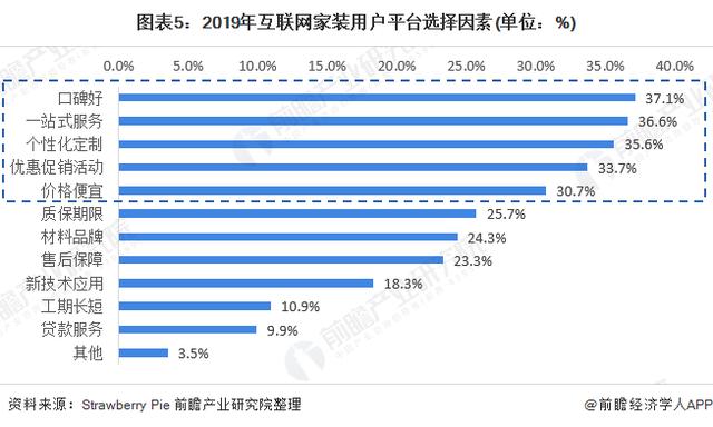 据调查,2019年我国互联网家装用户在选择平台时主要考虑因素为口碑、一站式服务、个性定制、优惠促销和价格等因素。其中37.1%的用户会优先考虑口碑,36.6%的用户会考虑一站式服务,35.6%的用户会考虑个性定制化服务。