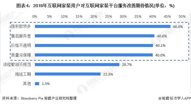 据调查,2019年我国互联网家装用户对互联网家装平台服务改善期待较高的主要为隐形款项多(46%)、售后服务差(40.6%)、价格不透明(40.1%)、质量没保障(40%)。