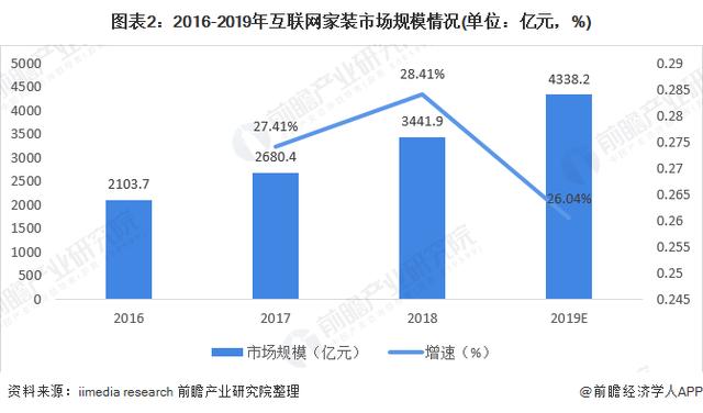 2016-2019年我国互联网家装市场整体呈逐年增长态势。2018年我国互联网家装市场规模为3441.9亿元,同比增长28.41%。随着互联网家装的不断普及,初步估算2019年我国互联网家装市场规模近4338.2亿元。