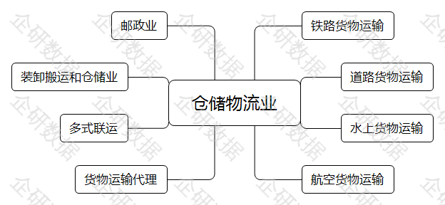 企研数据参照国民经济行业分类,将仓储物流行业划分成铁路货物运输、道路货物运输、水上货物运输、航空货物运输、货物运输代理、多式联运、装卸搬运和仓储业以及邮政业八部分,并基于此划分构建了仓储物流业专题数据库。