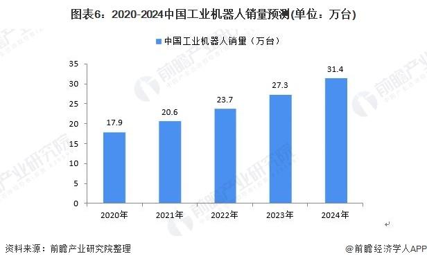 现阶段,中国工业机器人产业随着下游行业需求增速放缓,叠加政策退出,2018-2019年行业进入调整期,根据国外经验以及预测模型测算,前瞻预计,未来 5 年行业销量增速达 15%,到2024年,中国工业机器人销量将突破31万台。