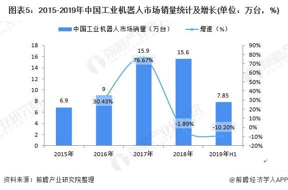从具体销量来看,2015-2017年中国工业机器人不断增长,2017年增长至15.9万台,涨幅达到76.4%。2018年,由于工业机器人最大需求行业——汽车行业迎来28年首次销量下滑,3C行业增长也大幅度回落,这两大行业的投资情况更是断崖式下跌,所以工业机器人需求量有所下降,2018年同比下降1.7%;2019年上半年同比下降10%,销量约为7.85万台。