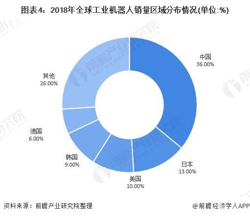 根据IFR统计,2018年中国、日本、韩国、美国和德国五大工业机器人市场占到全球安装量的74%。其中,2018年中国工业机器人市场累计销售工业机器人15.6万台,同比下降1.73%,占全球的比重达到36%,但年销量连续第六年位居世界首位。