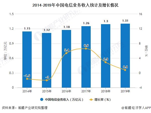 根据工信部发布的数据:2019年中国电信业务收入累计完成1.31万亿元,比上年增长0.8%。2019年9月份开始国内三大电信运营商普遍取消相关低价竞争销售策略,行业收入增速持续5个月反弹。