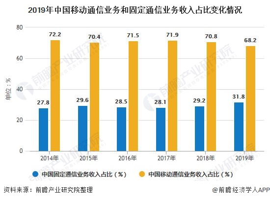 2019年中国固定通信业务保持较快增长,占比持续提高。根据工信部发布的数据:2019年,固定通信业务收入完成4161亿元,比上年增长9.5%,在电信业务收入中占比达31.8%,占比较上年提高2.6个百分点;移动通信业务实现收入8942亿元,比上年减少2.9%,在电信业务收入中占比降至68.2%。