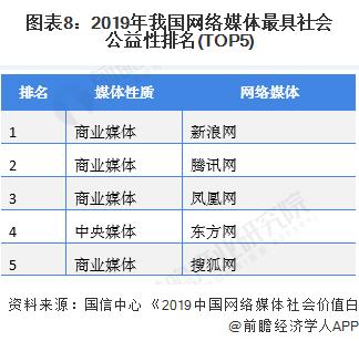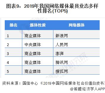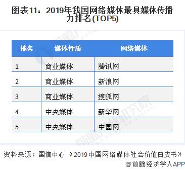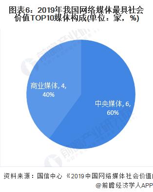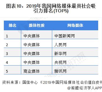 据《2019中国网络媒体社会价值白皮书》评估结果显示,2019年我国最具社会价值媒体TOP10中,中央媒体占六家,商业媒体占四家。其中,在中央媒体中,人民网、新华网、央视网分别排在第1位、第2位、第4位;在商业媒体中,腾讯网、新浪网、凤凰网、今日头条分别排在第3位、第5位、第7位、第8位。