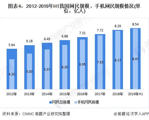 同时,我国手机网民规模也日益扩大,且在2012-2019年间的增长幅度始终大于全国网民总规模。数据显示,2019年上半年,我国网民规模为8.54亿人,其中,手机网民规模为8.47亿人,占比99.18%。