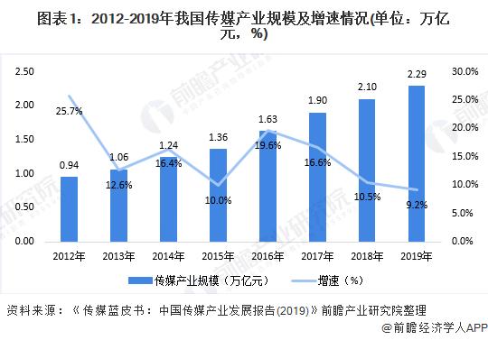 根据清华大学传媒经济与管理研究中心、CTR、CSM与社会科学文献出版社联合发布的《传媒蓝皮书:中国传媒产业发展报告(2019)》统计数据显示,2012年以来,我国传媒产业规模始终保持较快的增长速度。2018年,中国传媒产业总规模达2.10万亿元,首次突破2万亿元大关;2019年,据蓝皮书课题组估算,中国传媒产业规模约2.29万亿元,增长速度放缓到9.2%。