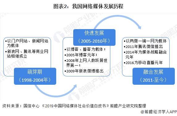 根据国家信息中心发布的《2019中国网络媒体社会价值白皮书》所述,我国网络媒体的发展历程大致可以分为三个阶段,即以门户网站、新闻网站为载体的萌芽发展阶段,以博客、播客为载体的快速发展阶段,以及以两微一端一网为载体的融合发展阶段。