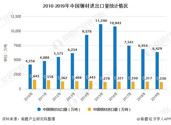 在进出口情况方面,根据中国工信部原材料工业司公布的最新数据显示,2019年1-12月钢材进出口双双下降。12月,中国国钢材出口468万吨,同比降低15.7%;1-12月出口6429万吨,同比降低7.3%,出口金额537.6亿美元,同比降低11.3%。12月,我国钢材进口148万吨,同比增长47.4%;1-12月份进口1230万吨,同比降低6.5%,进口金额141.1亿美元,同比降低14.1%。