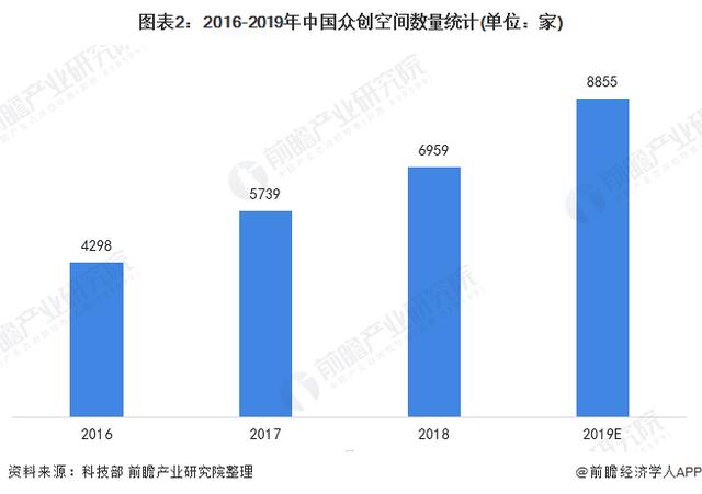 从众创空间的数量来看,近年来,我国众创空间数量呈逐步增多的态势。2018年,我国众创空间数量达6959家,较2017年增加1200多家,前瞻推算,2019年,我国众创空间数量进一步增多,约为8855家左右。