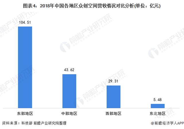 众创空间是具有双边网络效应和创新涌现型特质的双边创新型平台,为创新创业者提供便利化和信息化服务,近年来,多部政策出台鼓励众创空间的发展。从众创空间收入情况来看,我国东部地区众创空间数量较多,创造的收入较高,中部、西部、东北地区的收入较我国东部地区仍有一定差距。