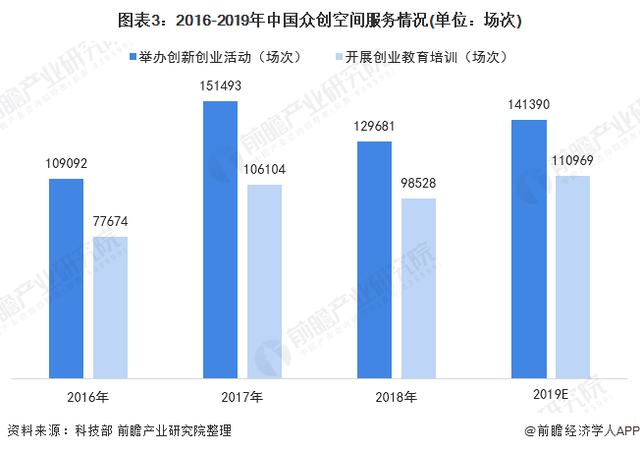 从创新创业培训情况看,2016-2018年,我国众创空间举办创新创业活动场次波动变化,据科技部发布的《中国火炬统计年鉴2019》数据显示,2018年,我国众创空间举办创新创业活动12.97万场次,开展创业教育培训9.85万场次,前瞻推算,2019年,我国众创空间约举办创新创业活动14.14万场次,开展创业教育培训11.10万场次。