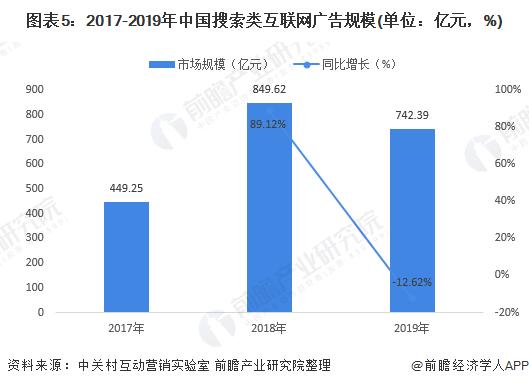 2019年,搜索广告出现负增长,2019年中国搜索类互联网广告市场规模达到742.39亿元,同比下降12.62%。