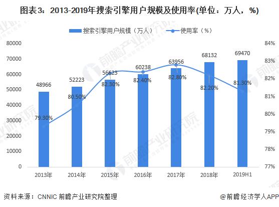 我国搜索引擎用户规模呈增长态势。截至2019年6月,我国搜索引擎用户规模达6.95亿人,较2018年底增加1338万人,半年增长率为2.0%,较同期网民规模增速(3.1%)低1.1个百分点;搜索引擎使用率为81.3%,较2018年底下降0.9个百分点。